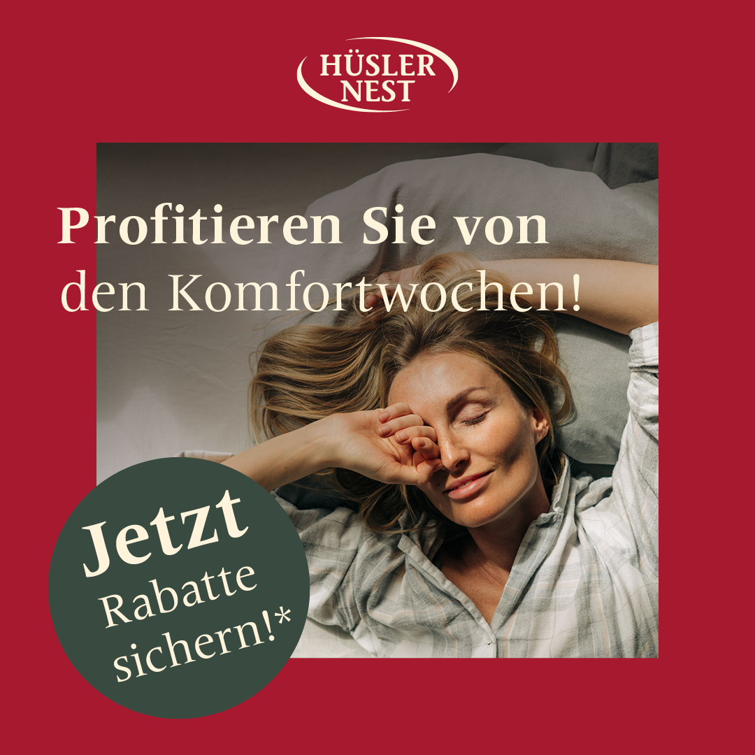 Erleben Sie echten Schlafkomfort – natürlich, individuell und nachhaltig. Mit einem Hüsler Nest spüren Sie den Unterschied. Nacht für Nacht! Erhalten Sie jetzt 10 % Rabatt auf das gesamte Hüsler Nest Programm.
